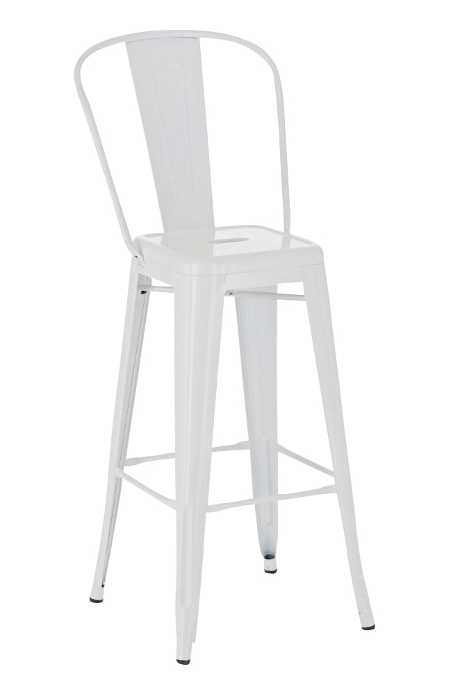 Acest scaun de bar din metal acoperit cu pulbere este întotdeauna cu adevărat stabil. Există traverse între picioare și sub scaun care asigură un nivel ridicat de stabilitate - primele servesc, de asemenea, ca un suport confortabil pentru picioare.